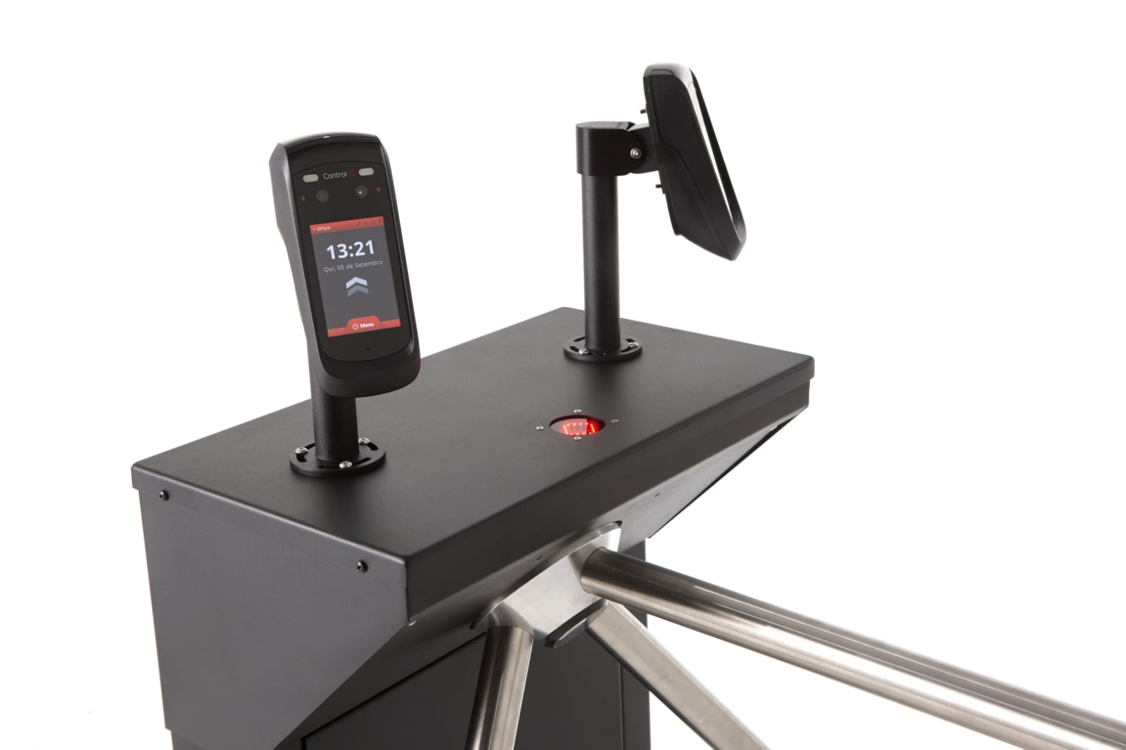 O equipamento conta com um suporte integrado que permite a operação com apenas um iDFace instalado, oferecendo o controle combinado de entrada ou da saída.
